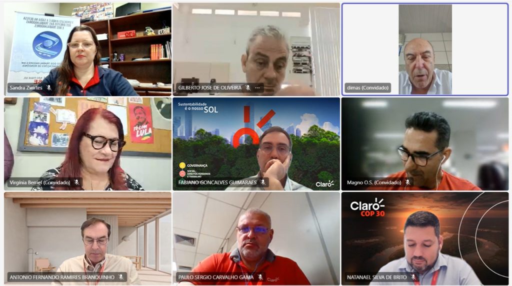 Sandra Zwirtes (Sinttel RO) Gilberto Oliveira (Sinttel-PE), Dimas (Federação LiVRE) Virginia Berriel (Sinttel-Rio), Fabiano Guimarães (Gerente RT Claro) Magno Olson da Silva (Sinttel ES) Antônio Ramos (Branquinho – Claro) Paulo Sérgio Gama (Sinttel MA) e Natanael Brito (Claro)