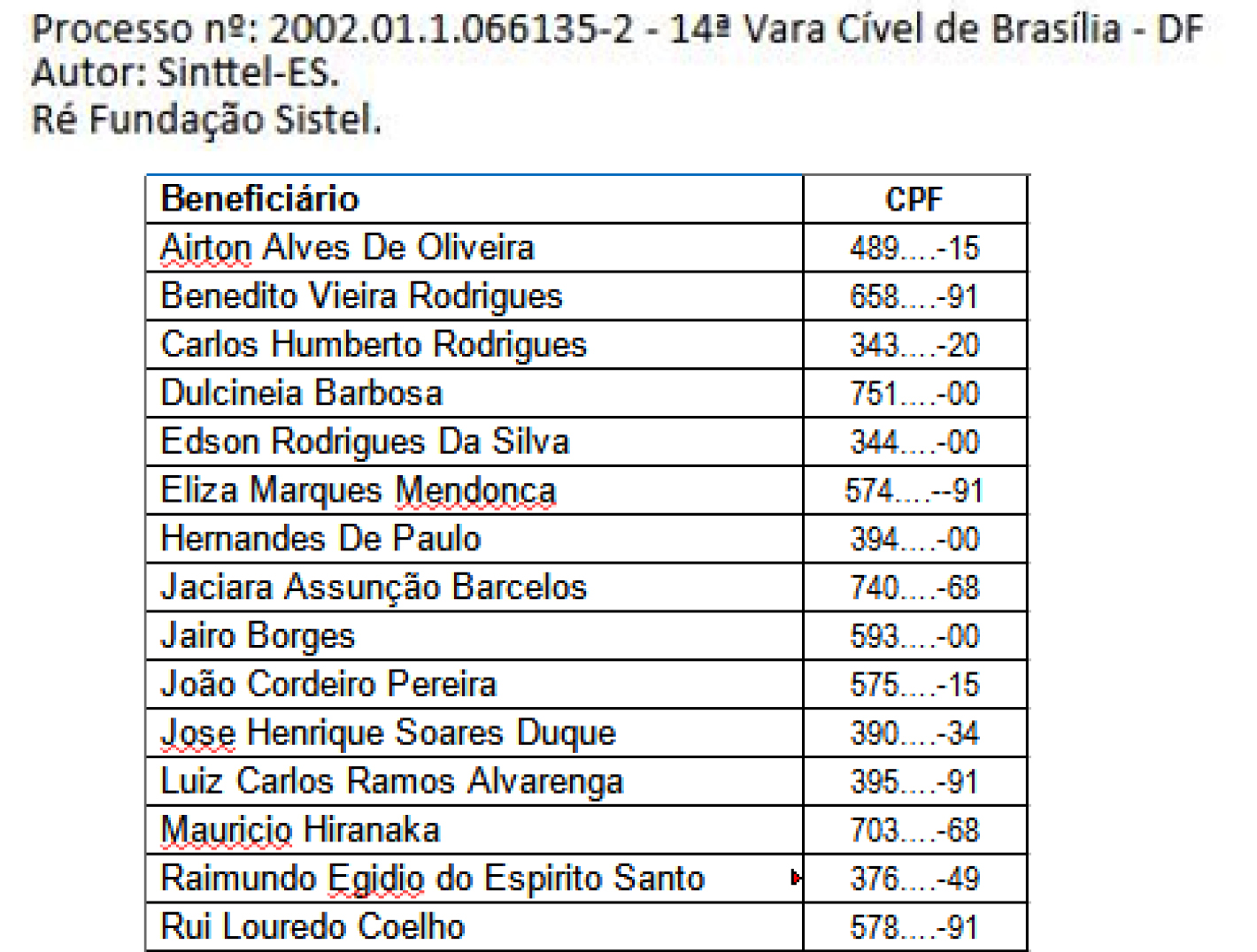 Os beneficiários da sentença coletiva são os empregados nas empresas de Telecomunicações no Estado do Espírito Santo que contribuíram para a SISTEL entre o período de 1987 a 1991 e sacaram todo o saldo de previdência privada (parcela pessoal) a partir de 22/08/1997.