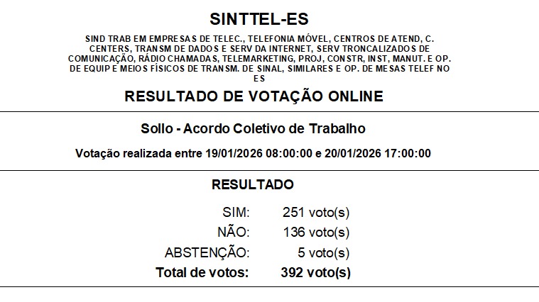 Com a proposta aprovada, haverá uma contribuição assistencial a ser descontada dos trabalhadores e trabalhadoras NÃO SINDICALIZADOS da Sollo Brasil para custeio das despesas geradas com a negociação do acordo coletivo pelo SINTTEL-ES. O valor é de 3% do salário base de cada empregado/a, divididos em três parcelas de 1% nos meses de Fevereiro, Março e Abril/2026.